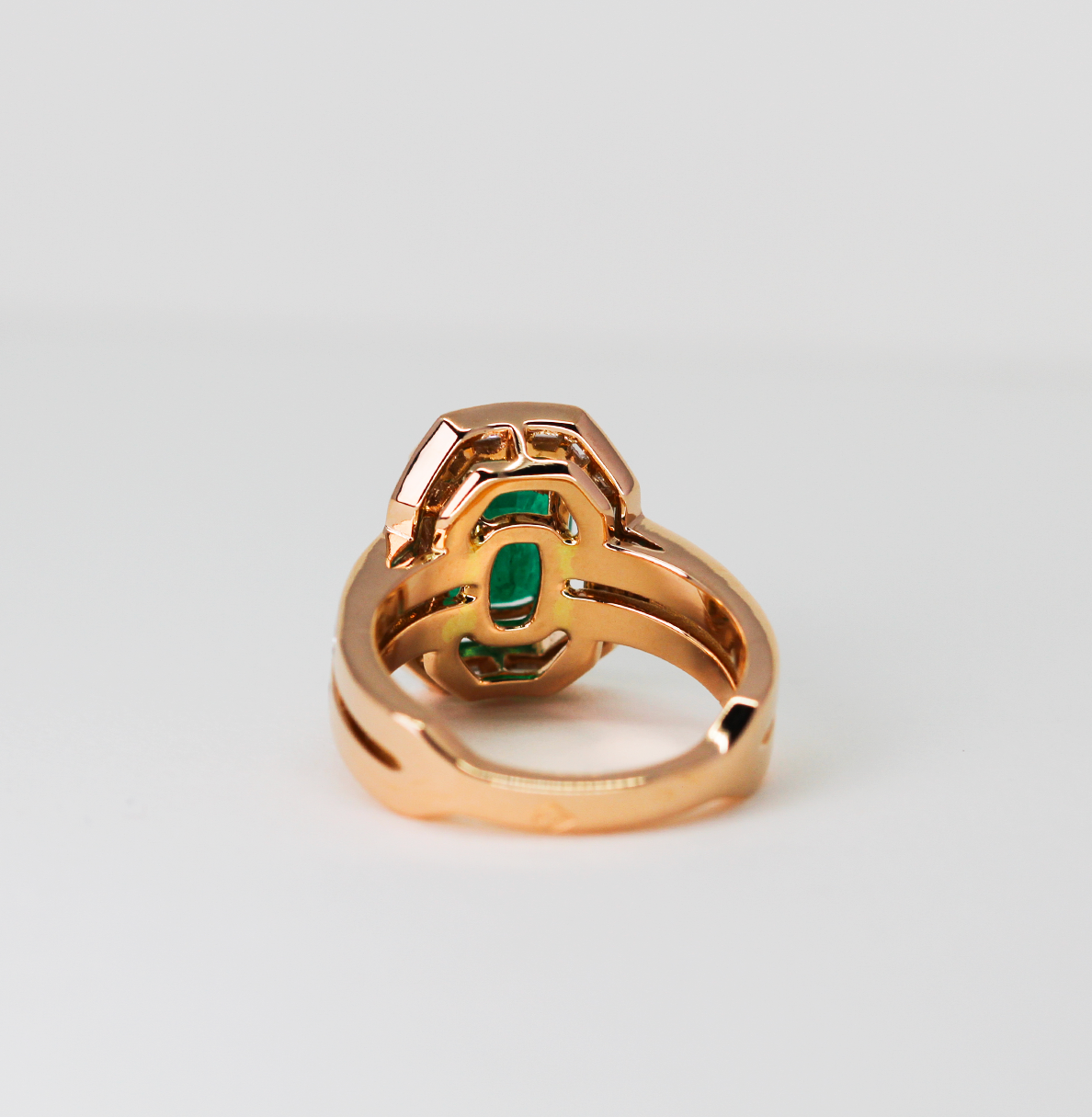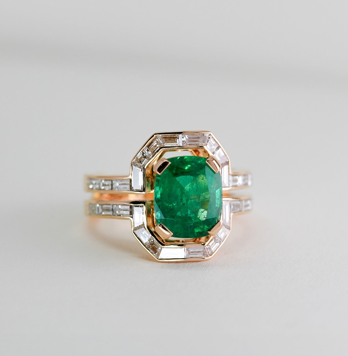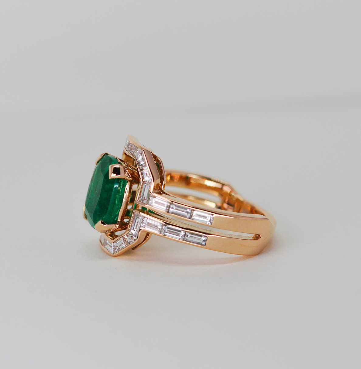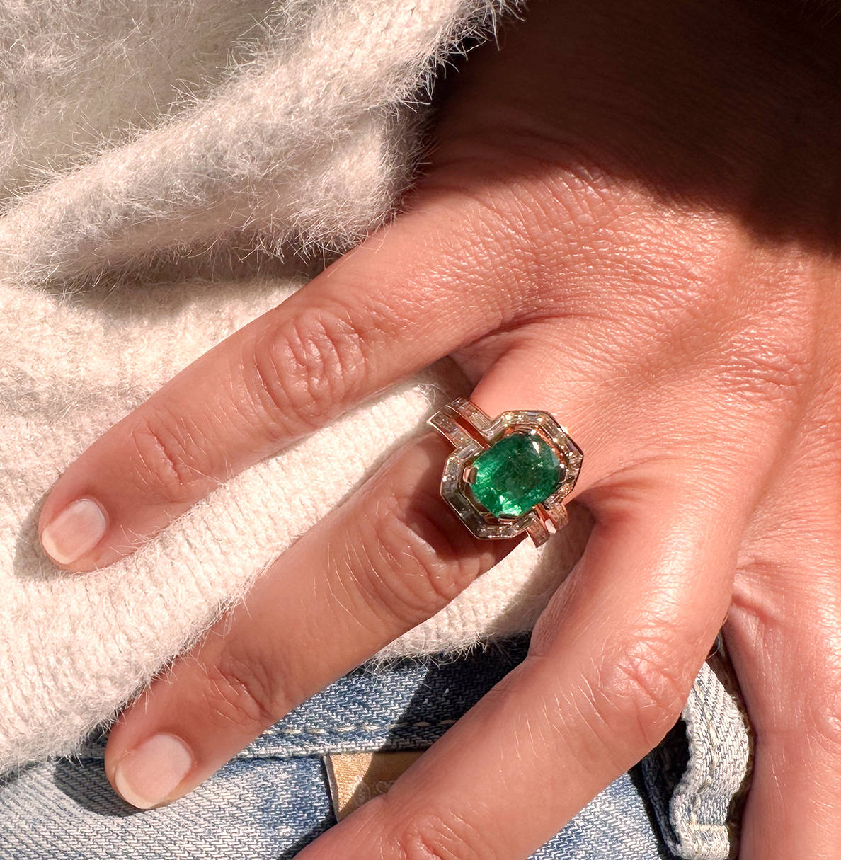 • Bague de fiançailles : Émeraude taille coussin 2,86 ct - Pavage de diamants baguettes - Monture double joncs en or rose 18k