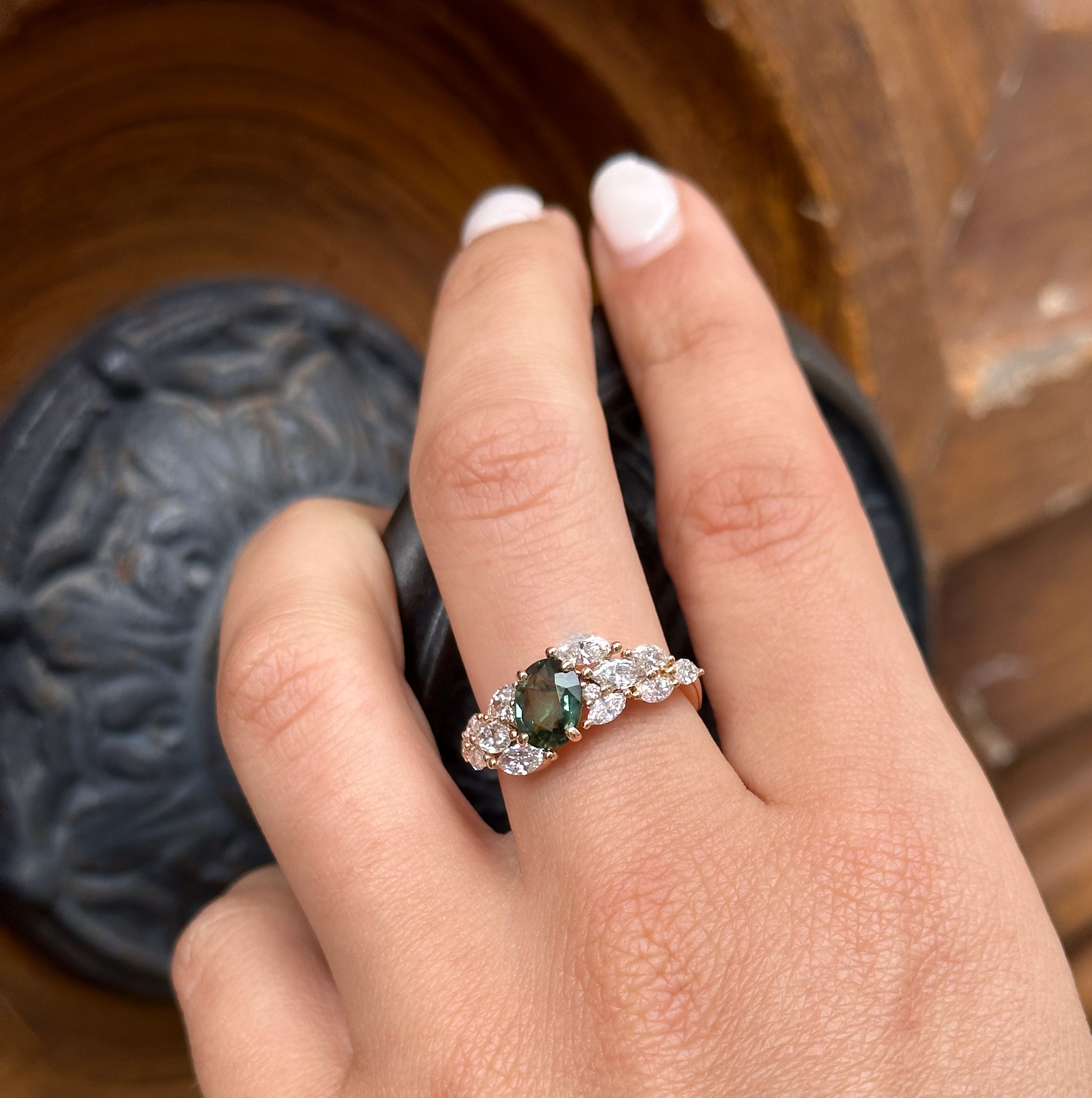 "La bague Ambre, est inspirée par l'olivier, symbolise la longévité et la sagesse. Chaque diamant qui orne ce magnifique saphir vert, célèbre les racines profondes de l'amour."