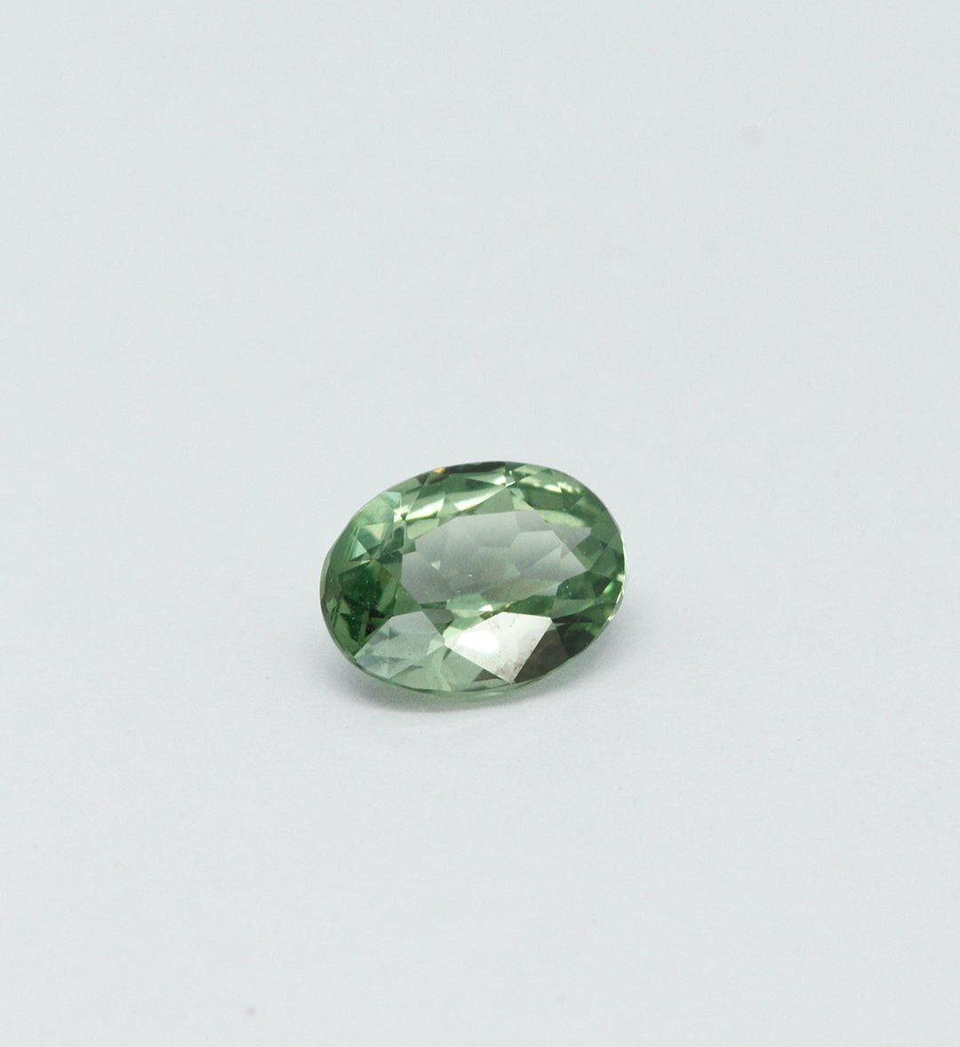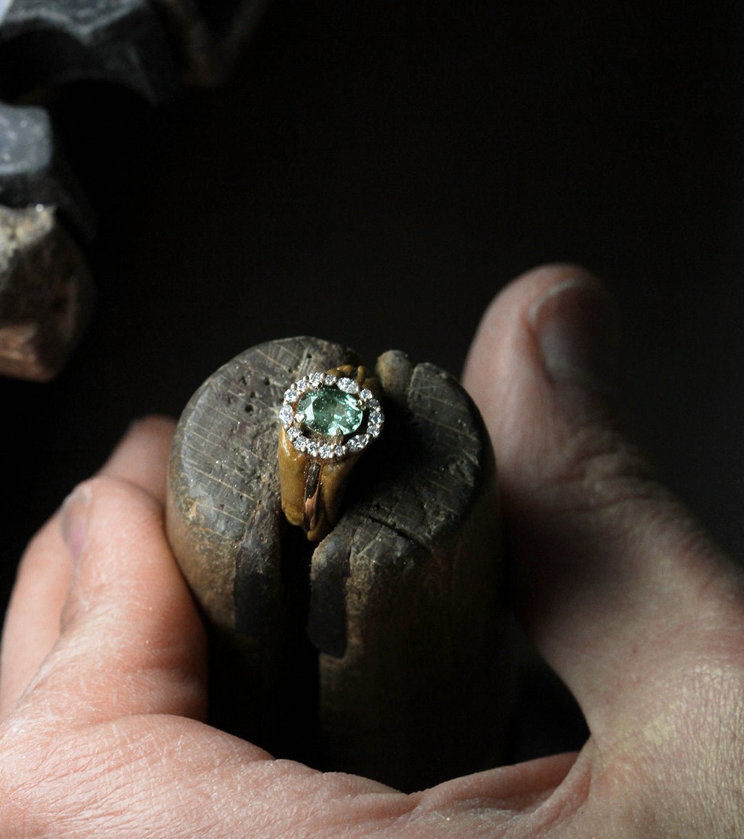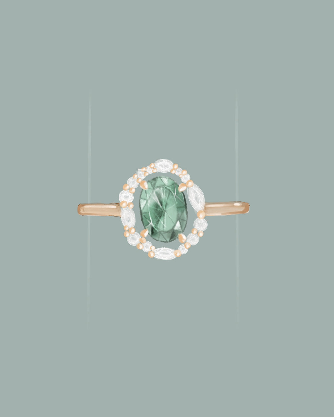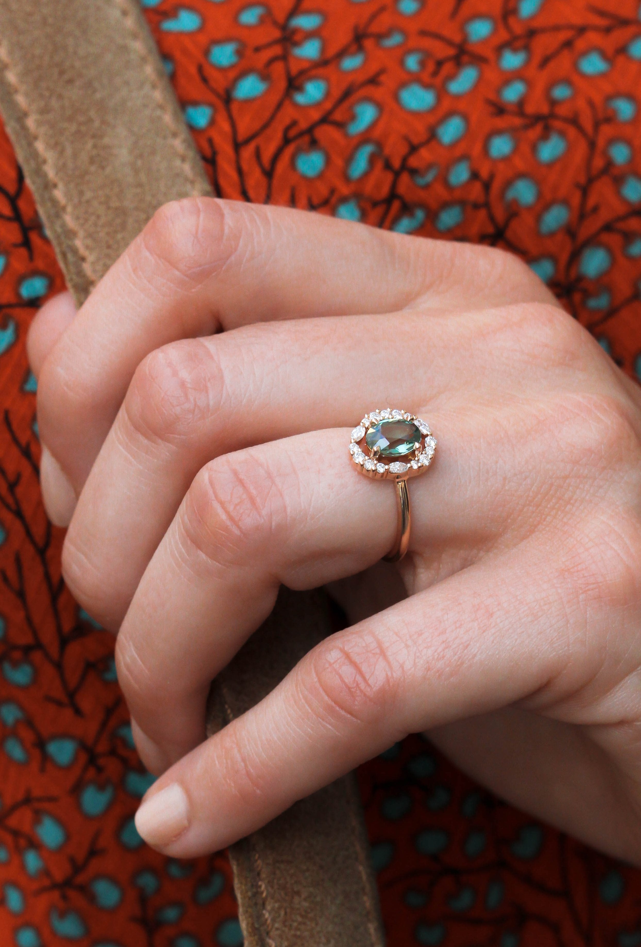 "Thibaut est venu avec une vision claire, il recherchait une pierre aux teintes délicates de vert d’eau ou de bleu turquoise, avec le charme irrégulier d’un serti entouré de diamants. Après plusieurs rendez-vous, nous avons trouvé l’équilibre parfait : un saphir vert entouré d’un pavage asymétrique mêlant diamants ronds et navettes. Ce design revisite les codes du solitaire classique en y apportant une touche moderne et audacieuse. La bague, à la fois bohème et précieuse, reflète parfaitement l’esprit du couple, amateurs de road trips et de liberté, plus proches des grandes évasions que des conventions classiques. Une création sur mesure, pensée pour célébrer leur histoire unique."