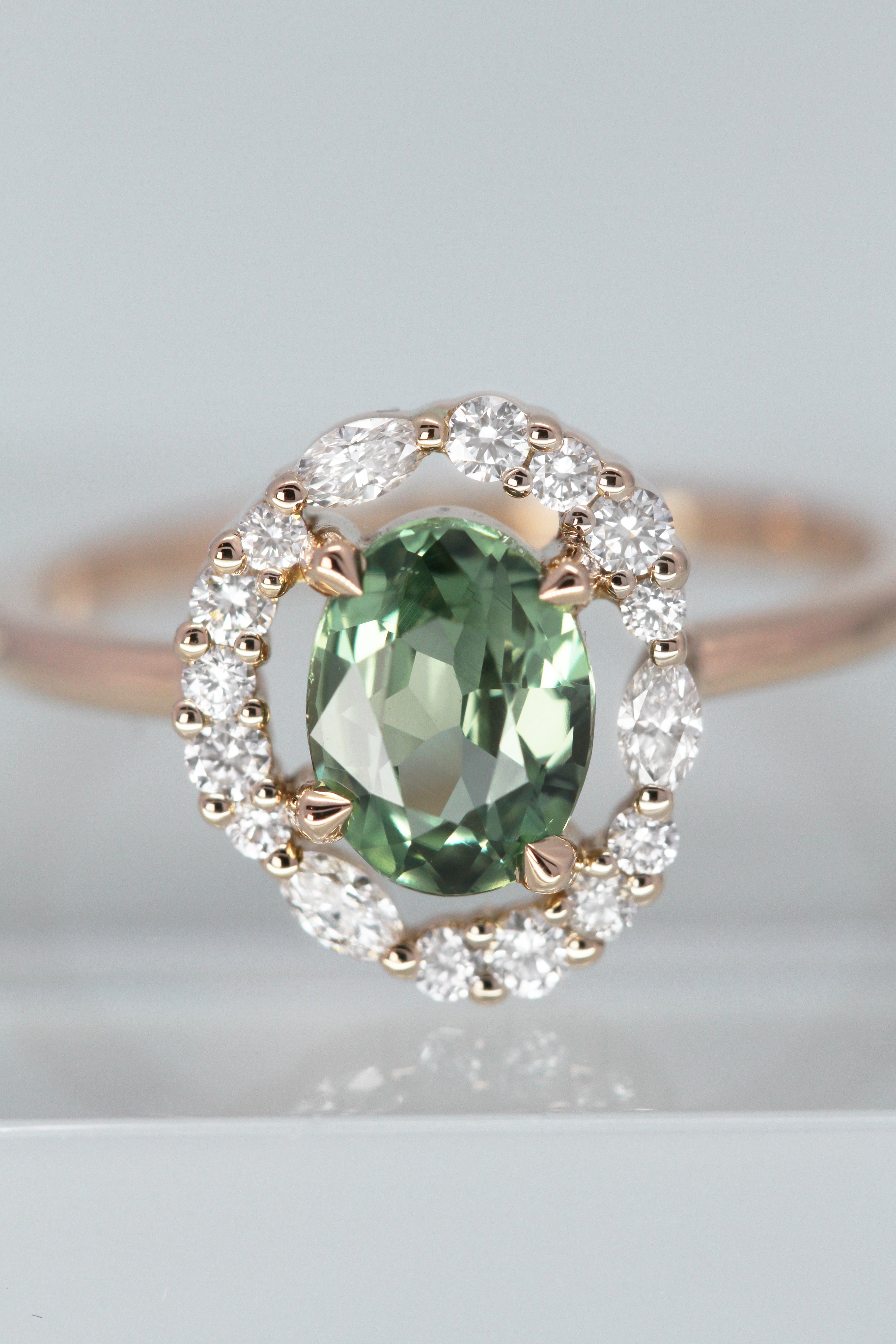 • Bague de fiançailles : Saphir vert taille ovale 1.08 ct - halo de diamants ronds taille brillant et marquises - monture en or rose 18k