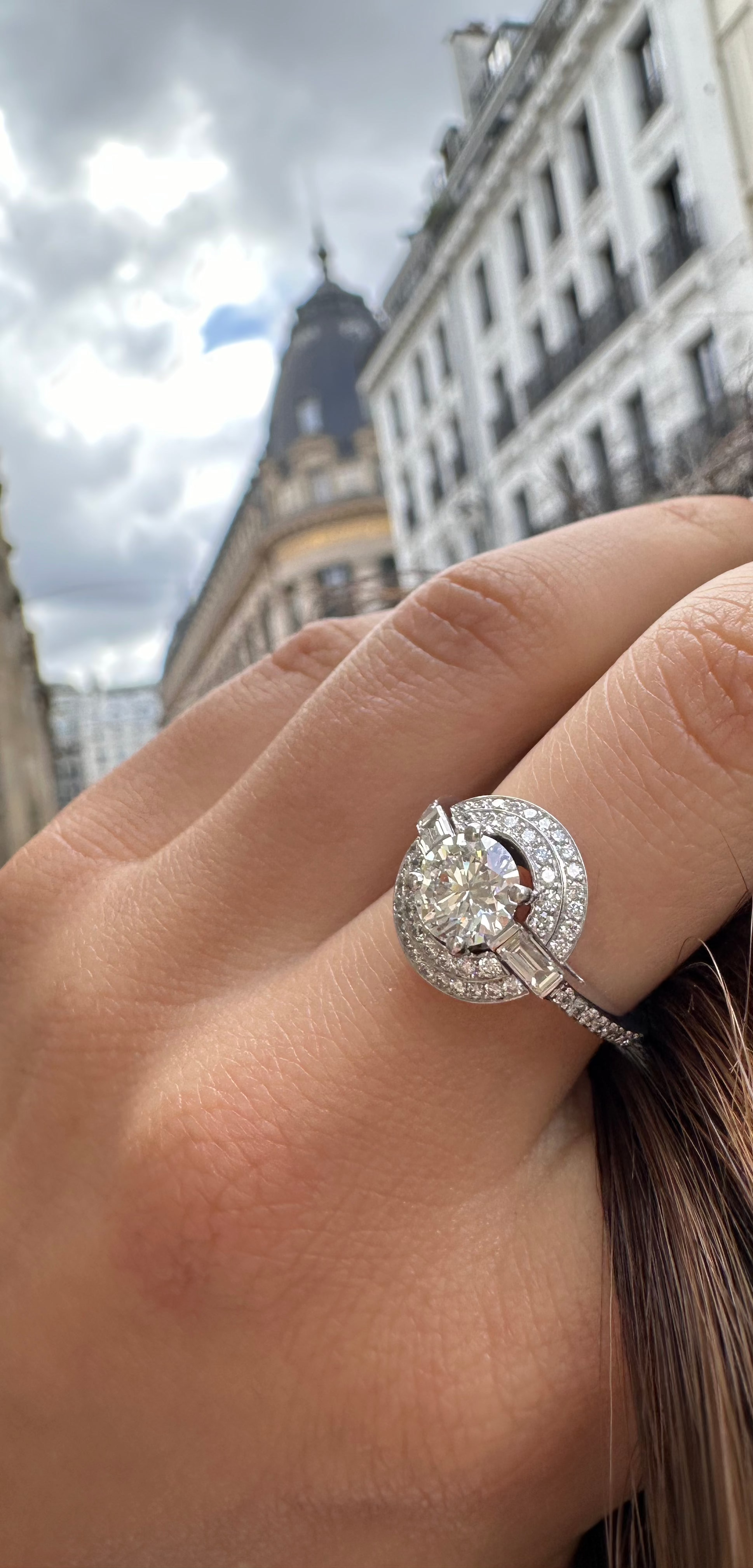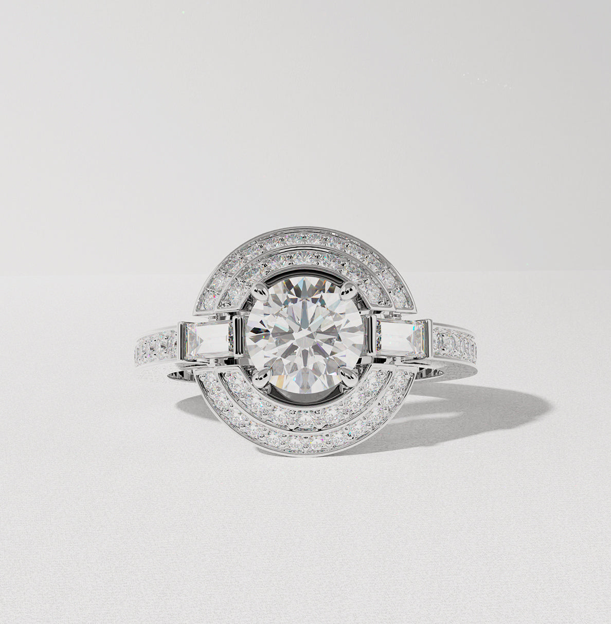 La pièce finale, met en valeur un diamant central rond, entouré par deux diamants baguette et rehaussé par un double halo étincelant de diamants. Le corps de la bague, minutieusement pavé, cache à l’intérieur des chiffres gravés, symbolisant leur histoire : les années partagées, le nombre d’enfants, et leurs rêves pour l’avenir."