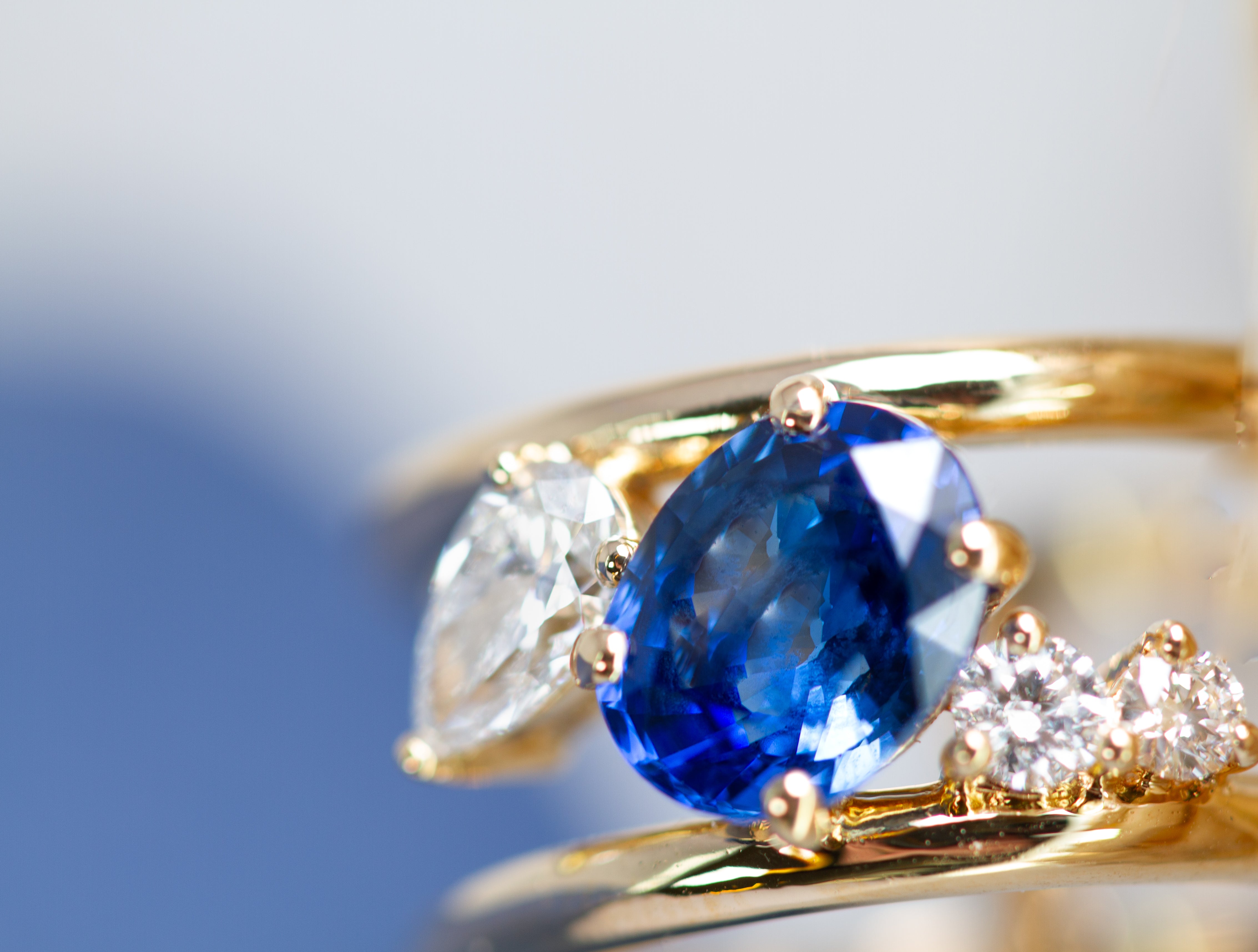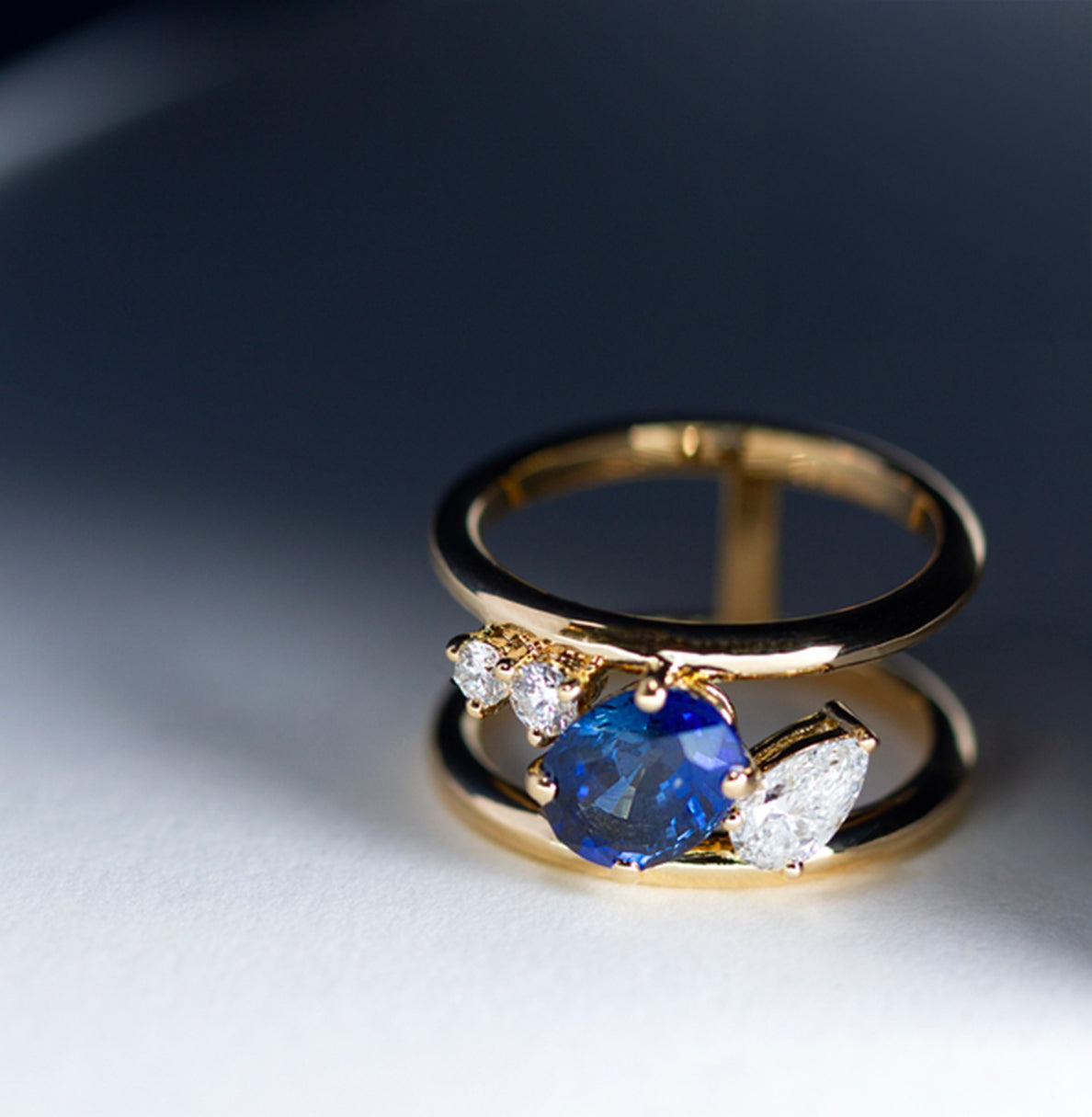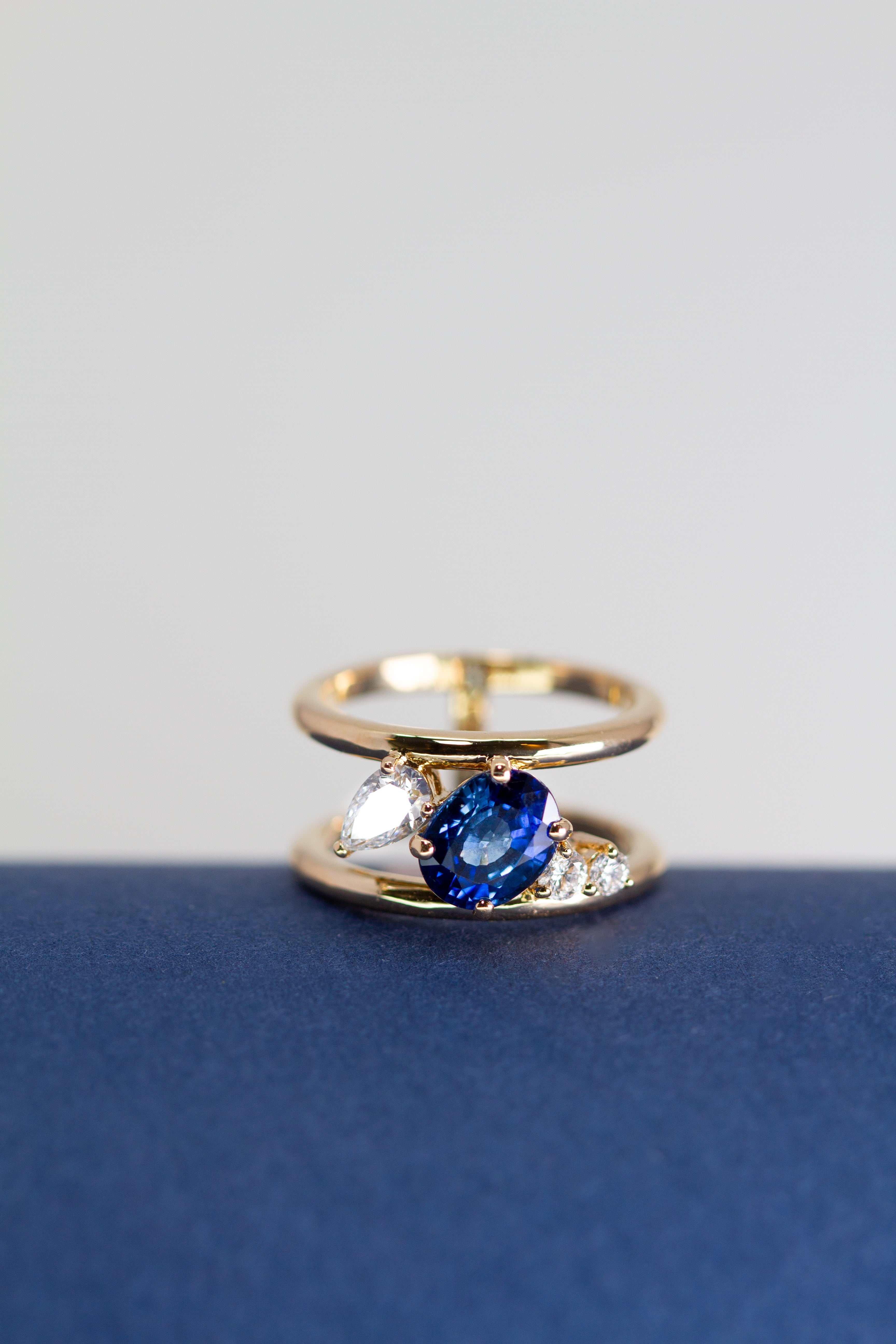 "Un design audacieux et plein de caractère pour cette bague de fiançailles bandeau, conçu pour sublimer une gemme exceptionnelle. Ce saphir, soigneusement choisi par Caroline et Théo pour sa teinte lumineuse, occupe le cœur de cette création. Il est accompagné d’un diamant taille poire et de deux diamants ronds, une composition qui met en valeur la pierre centrale avec subtilité et élégance. Une alliance parfaite entre modernité et raffinement pour célébrer leur amour."
