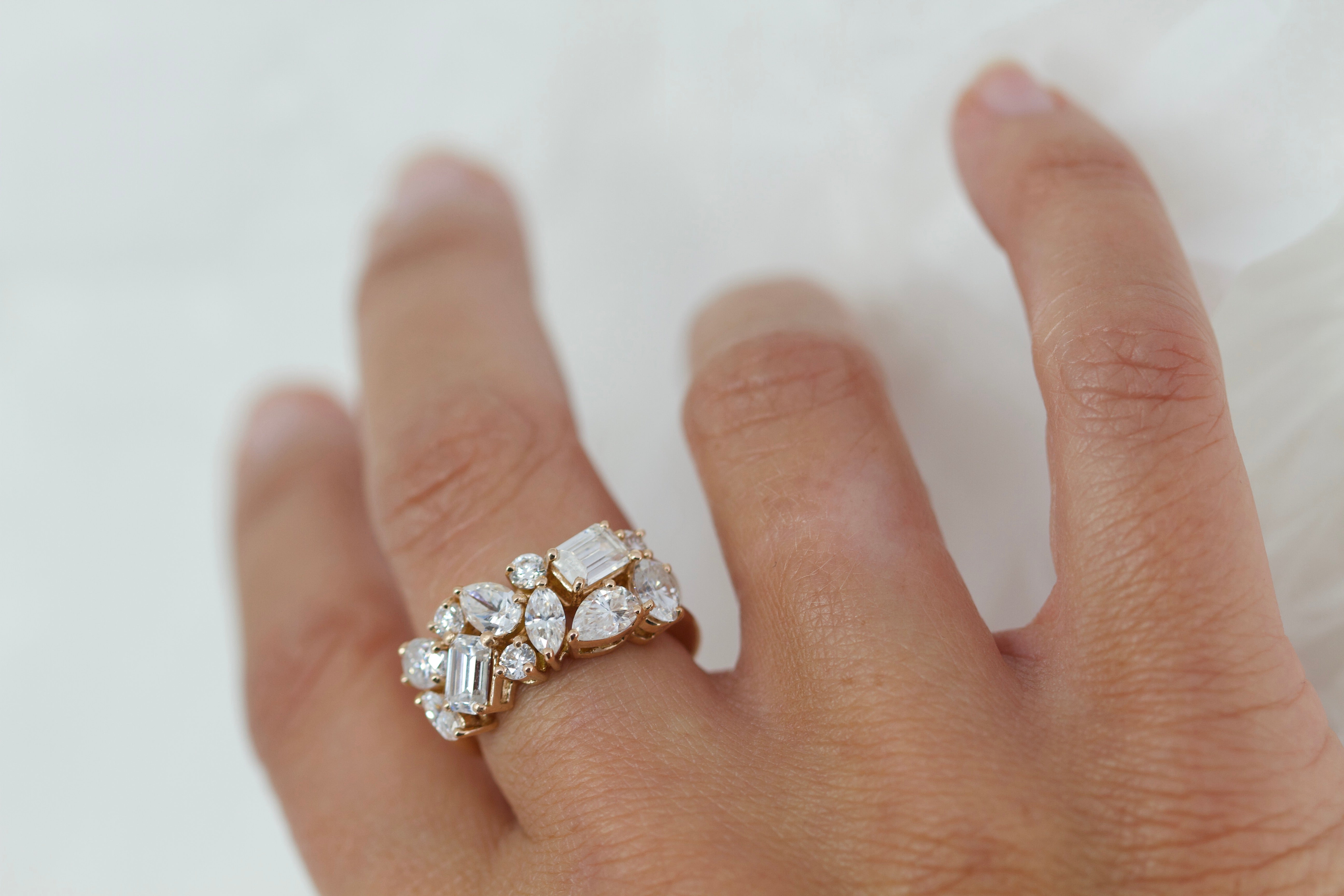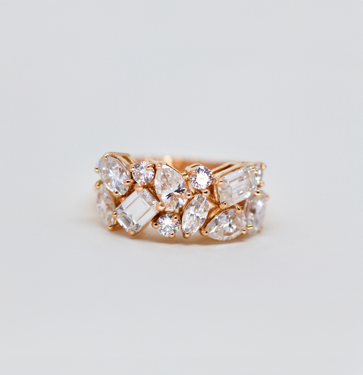 Entre tailles émeraude, poire, marquise et ovale, tout le travail s’est concentré sur l’harmonie et l’équilibre de la composition de moissanite. Comme un bouquet de fleurs éternel, cette création accompagnera la main de Catherine tout au long de sa vie.