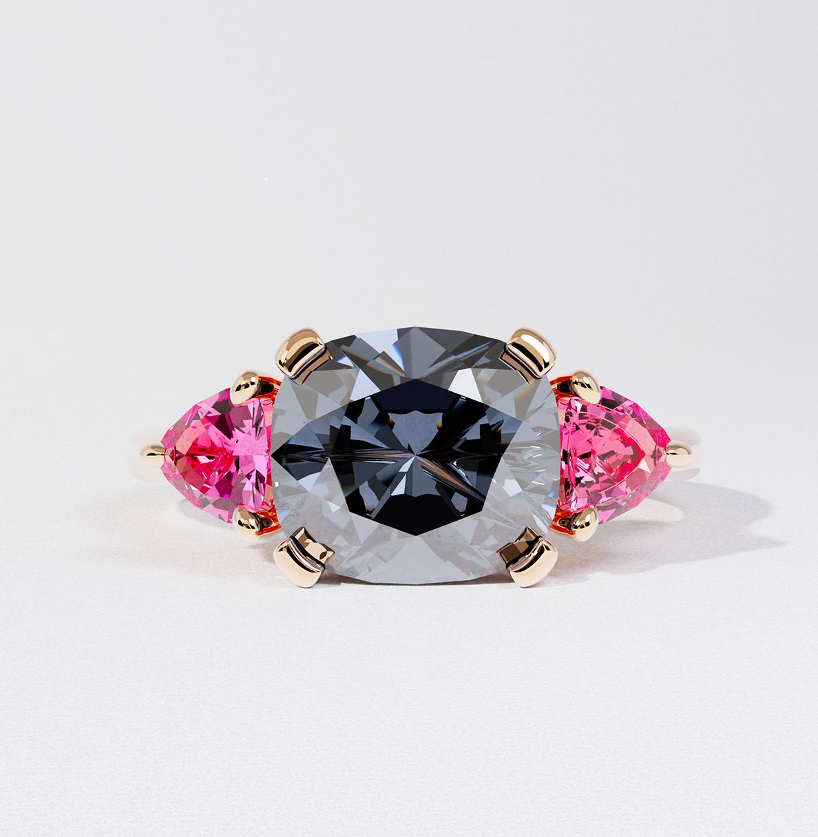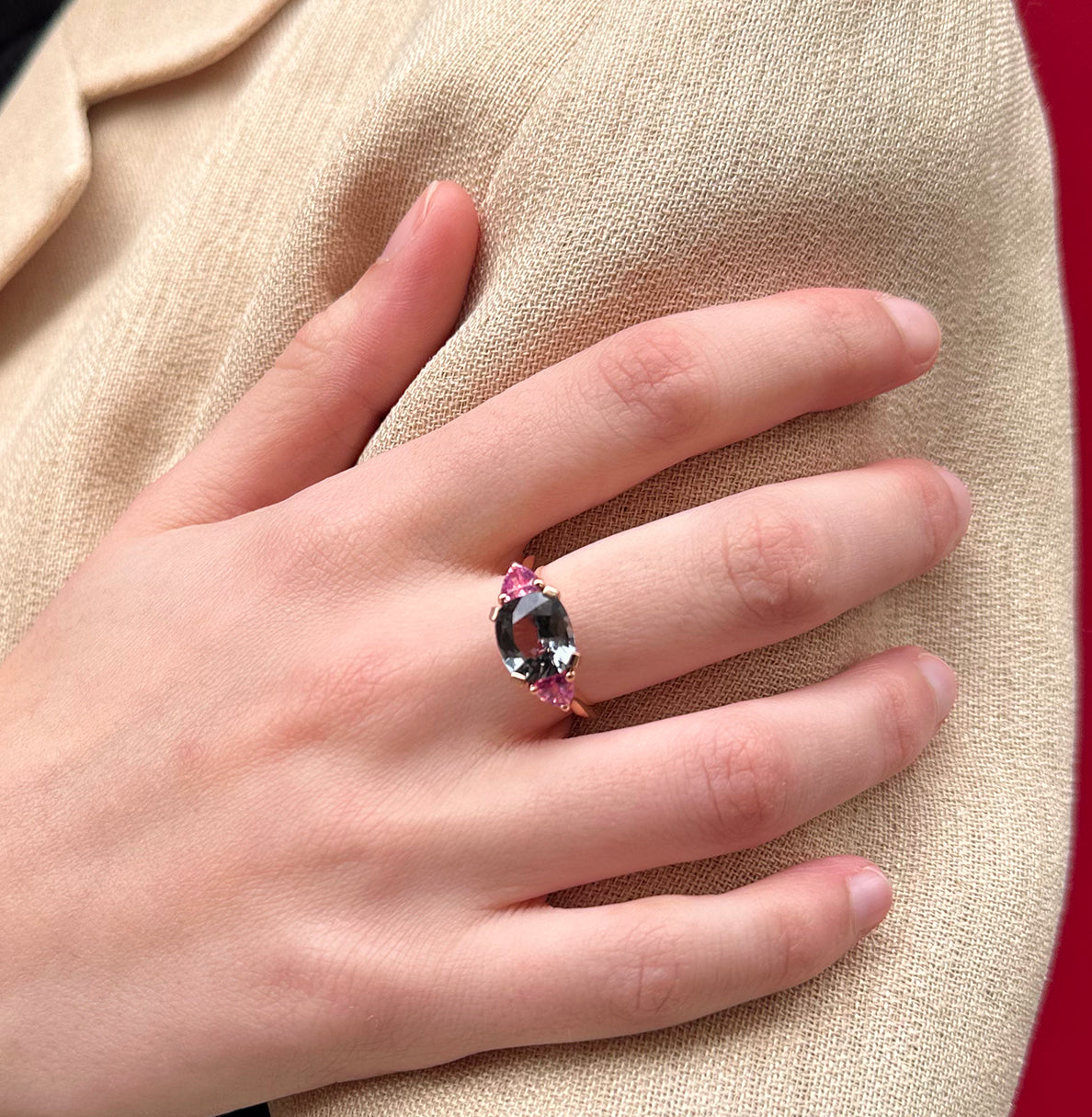 Bague d’anniversaire : Spinelle gris-bleu taille coussin - Saphirs roses taille trillion - Monture or rose 18k