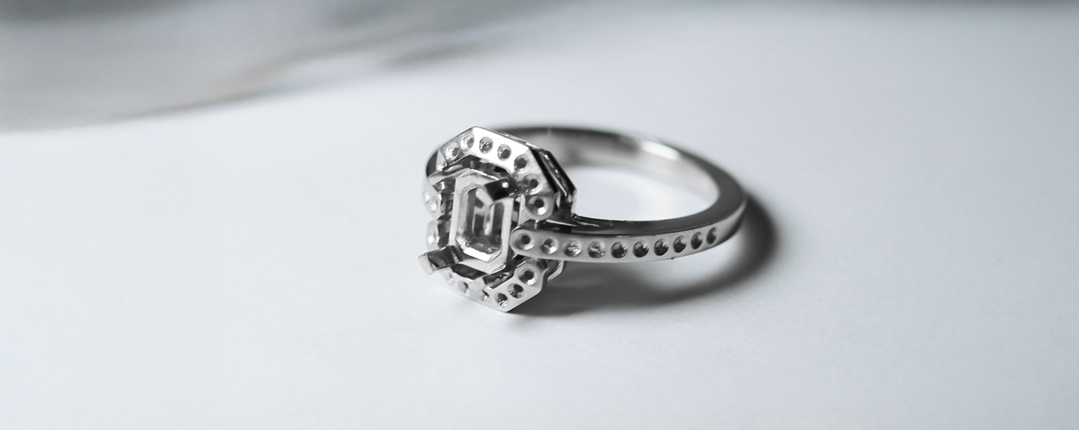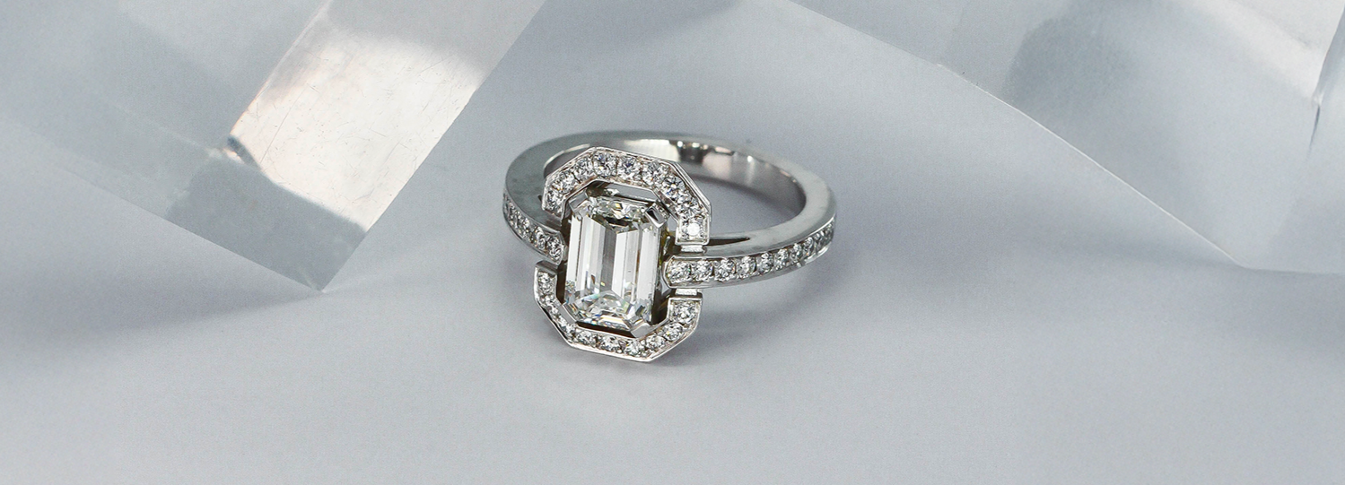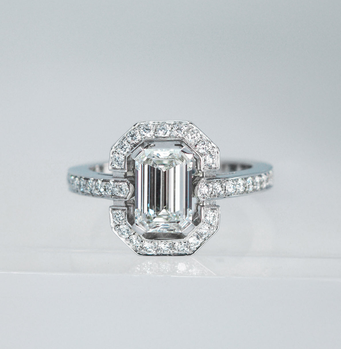 "Allan a souhaité concevoir une bague unique et chargée d’émotion pour sa demande en mariage. Investi dans chaque étape du processus, il a pris le temps de choisir LA pierre idéale. Ensemble, nous avons opté pour une magnifique pierre taille émeraude, parfaite pour son inspiration art déco. Cette création se distingue par ses lignes épurées et son design structuré. Deux rangées de diamants, légèrement décalées et séparées de la pierre centrale, créent un jeu subtil de lumière et de rythme. Le corps de la bague, entièrement pavé, est également séparé pour mieux mettre en valeur la pierre centrale"