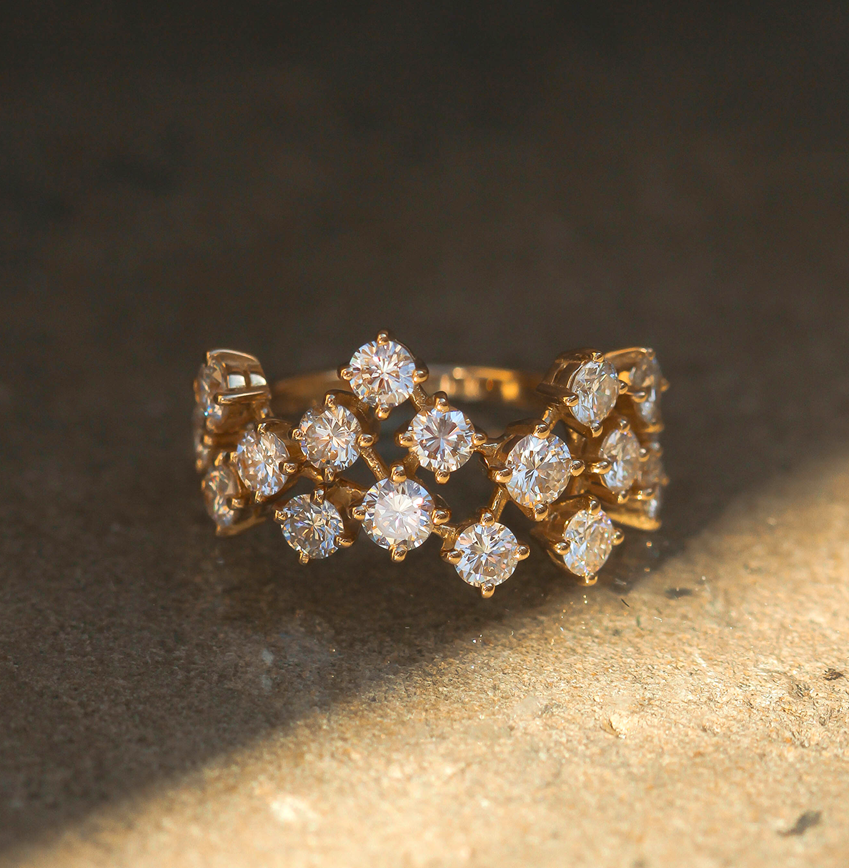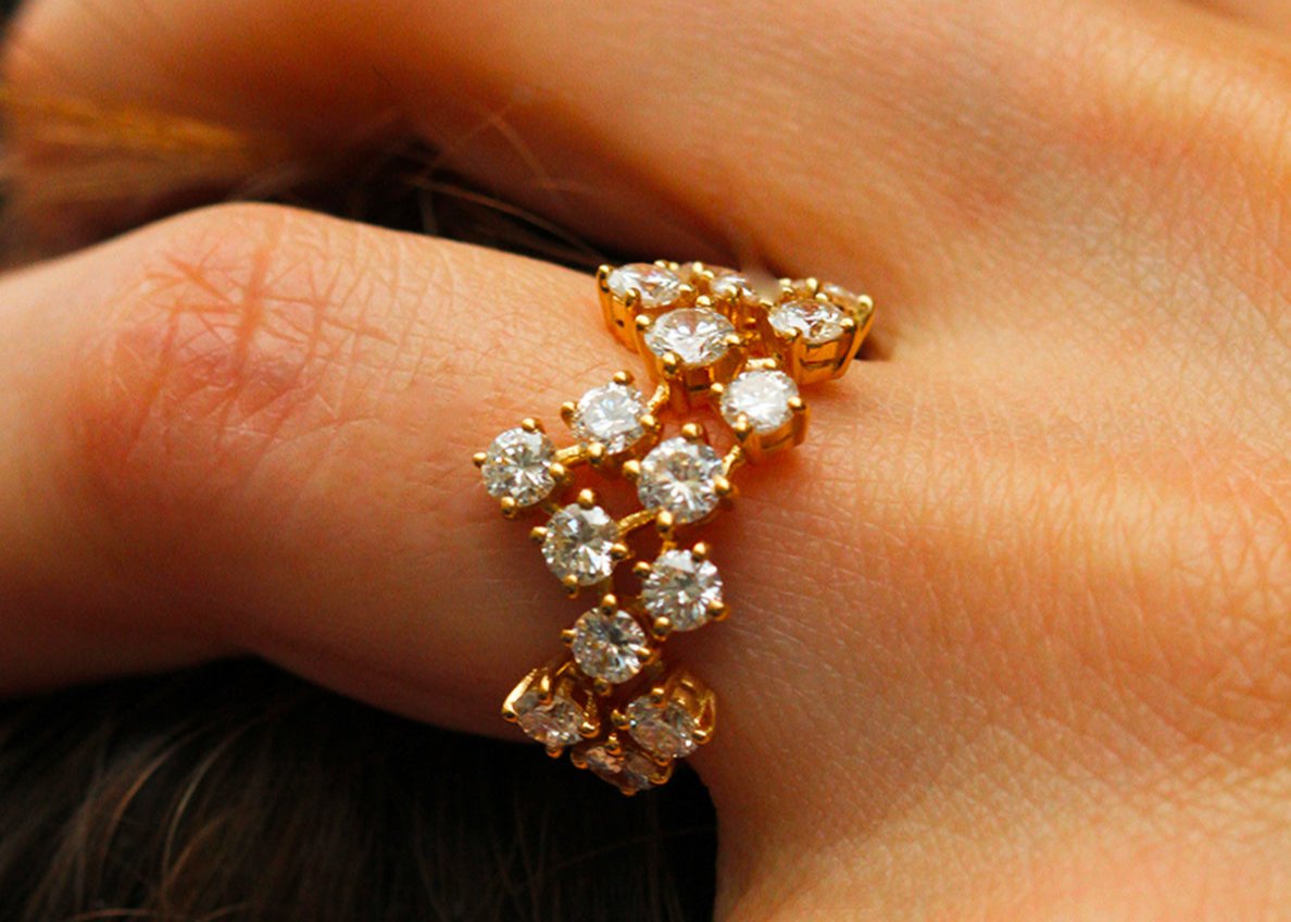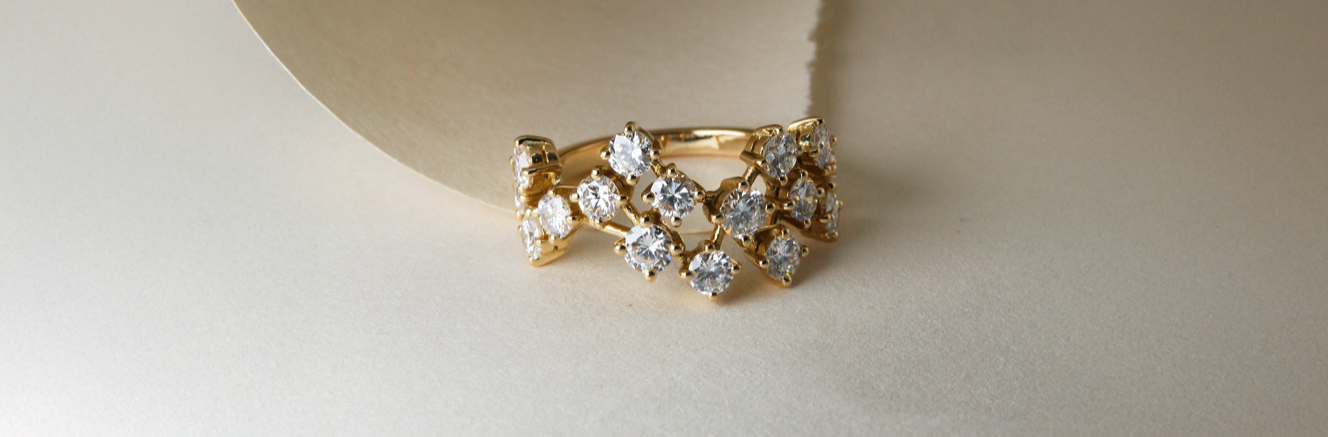 "Un design tout en légèreté. La bague Flora est une scintillante constellation de diamants, aérienne. Pour fêter la venue au monde de son enfant, elle souhaitait créer un bijou unique à partir d’un bijou de famille. Nous l’avons transformé en une bague remplie de symbolique, d’énormément d’amour, qu’elle pourra à son tour transmettre à son enfant."