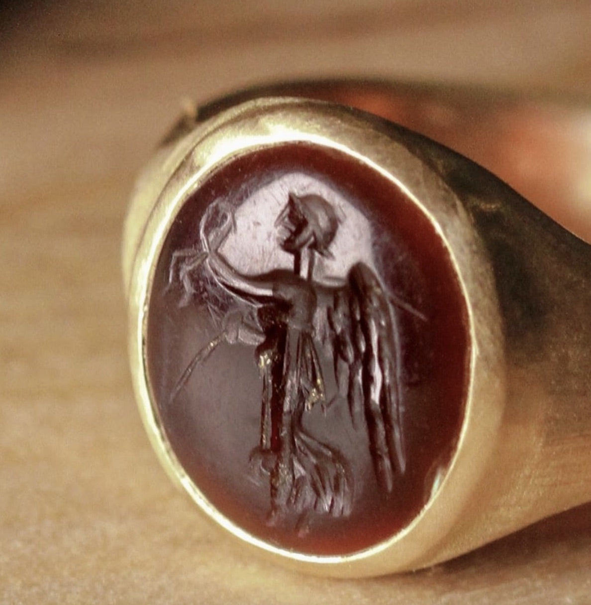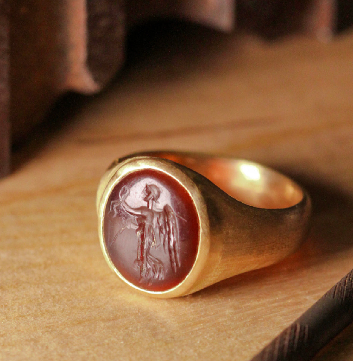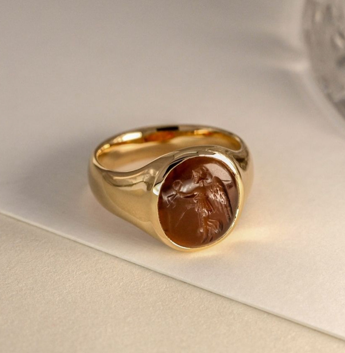 Chevalière en or jaune 18k - Camé d’une pierre antique en cornaline