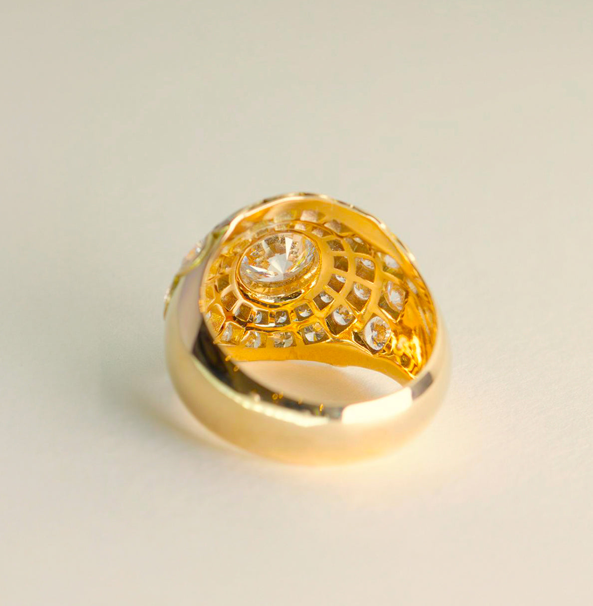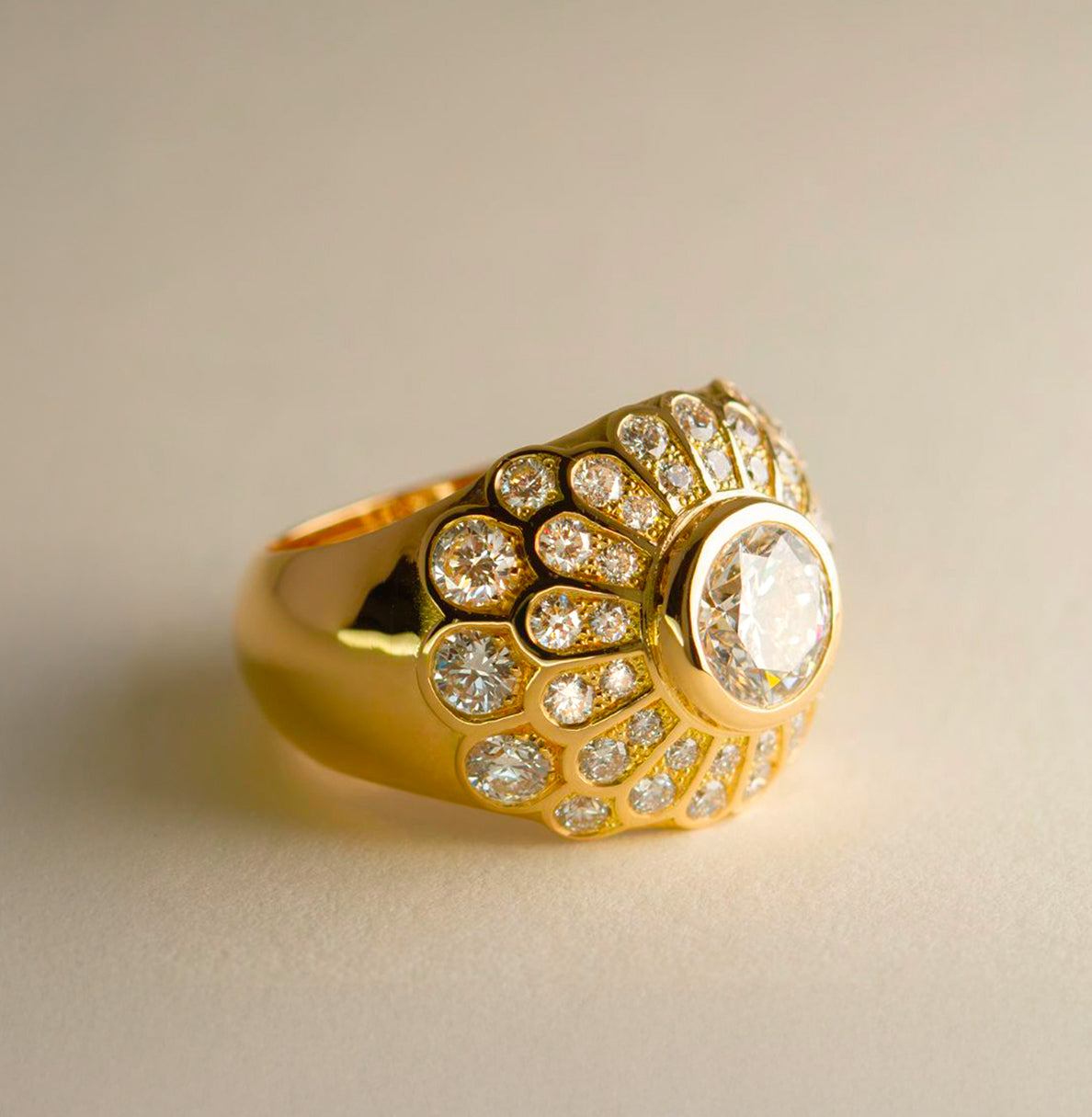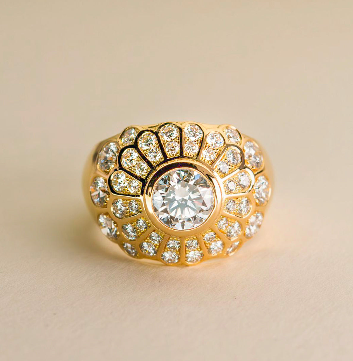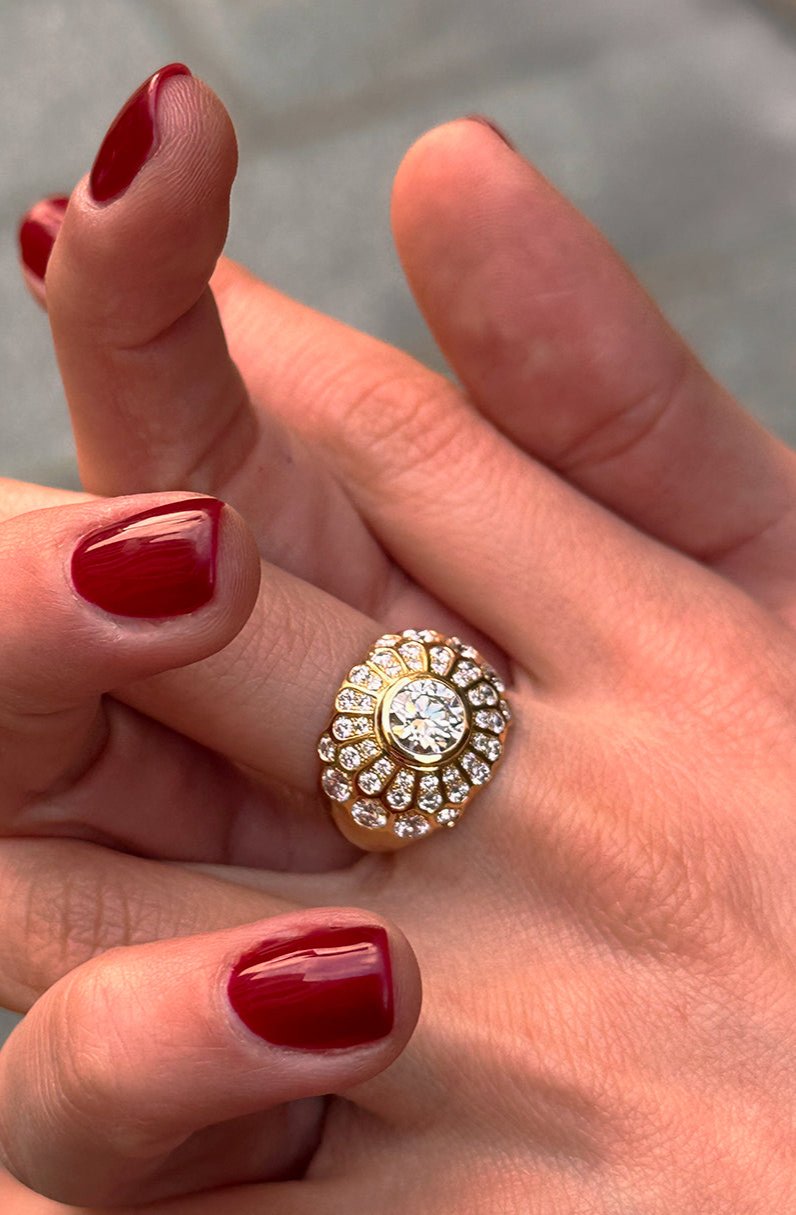 • Bague de fiançailles : Bague bombe style vintage - diamant rond taille brillant 1,41 ct - pavage de diamants - Or Jaune 18k