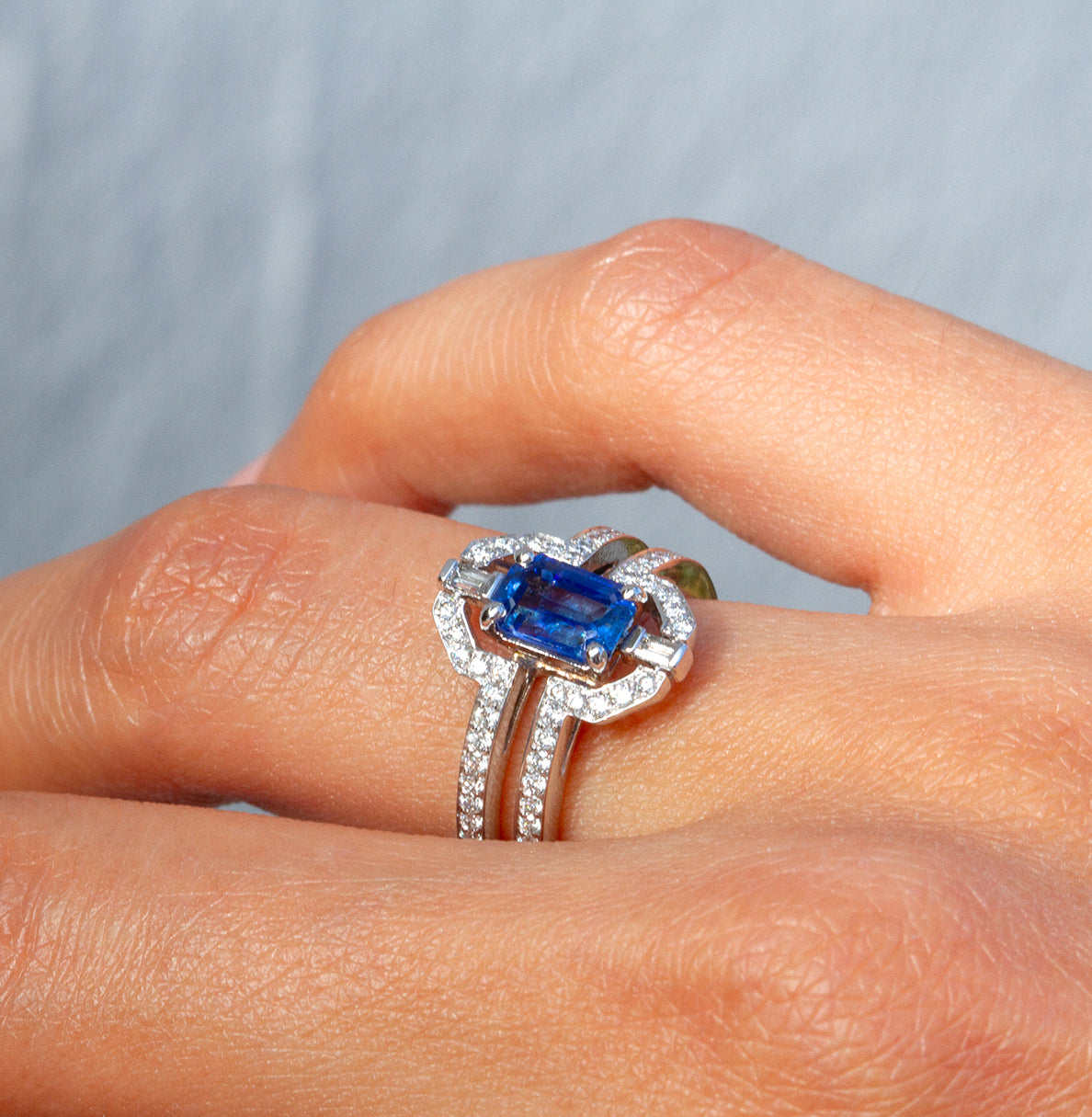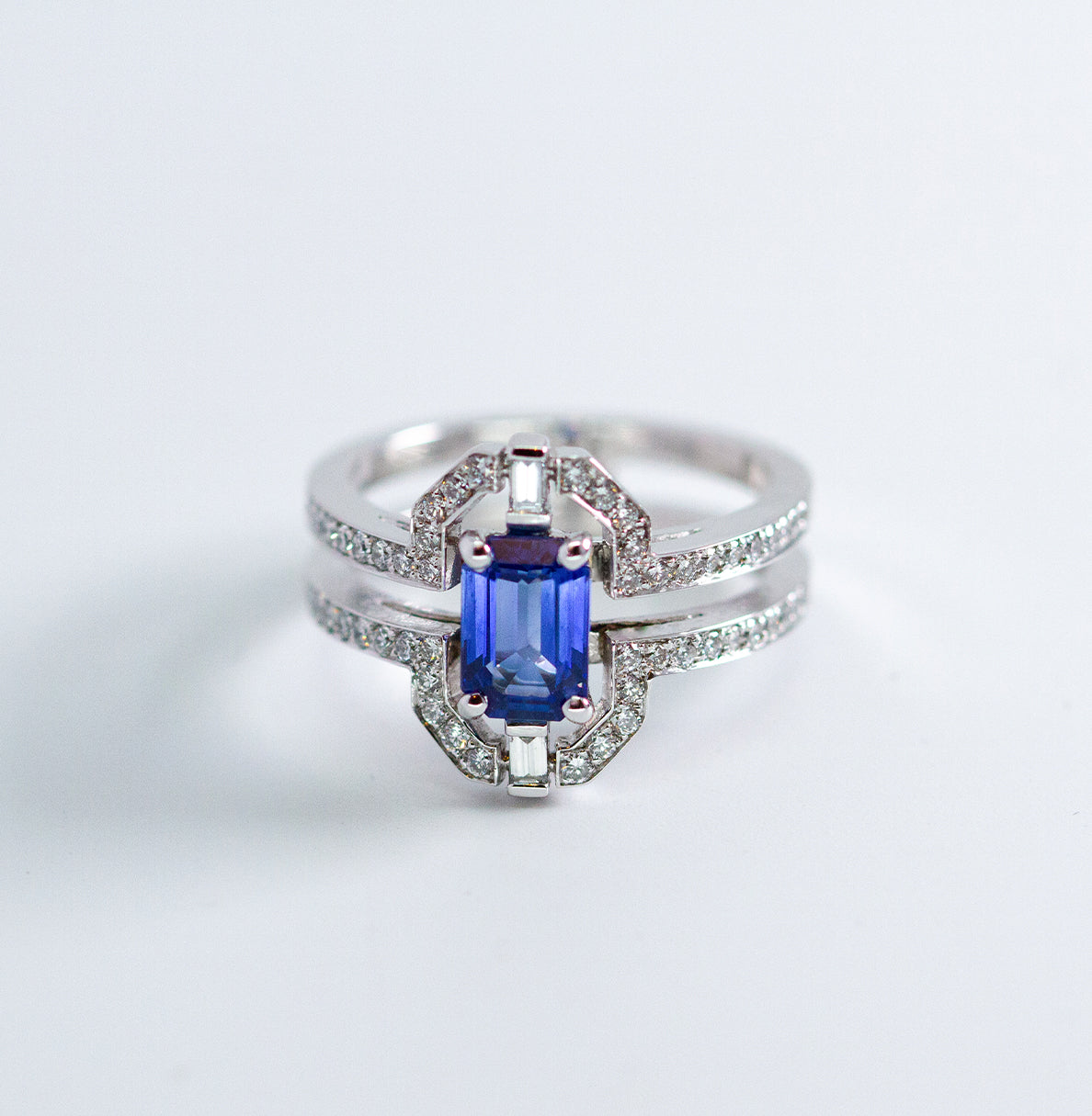 Cette bague au style art déco, avec son saphir taille émeraude, incarne parfaitement l'ADN de la maison 404. Conçue pour jouer avec la lumière et les lignes géométriques, elle reflète un design à la fois moderne et intemporel